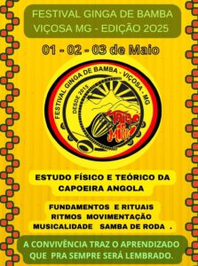 Evento tradicional oferece oficinas (com inscrição paga), rodas de capoeira angola gratuitas e convivências entre os dias 1 e 3 de maio. A cidade de Viçosa se prepara para sediar