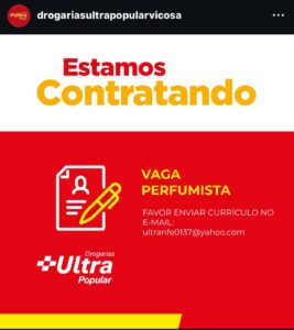 Drogarias Ultra Popular abre vaga para Perfumista em Viçosa: Detalhes e inscrição A Drogaria Ultra Popular em Viçosa está com uma vaga aberta para perfumista. Se você tem paixão por