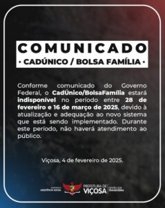 Atendimento ao público será suspenso temporariamente para adequação do CadÚnico/BolsaFamília ao novo sistema. O Governo Federal informou que o Cadastro Único (CadÚnico) e o sistema do Bolsa Família estarão indisponíveis