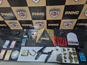 Ocorrência na MG-262 resultou na apreensão de drogas, armas, munições e materiais ligados ao tráfico A Polícia Militar registrou, no domingo (25), uma ocorrência de prisão por tráfico de drogas,