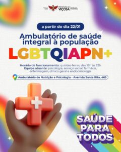 Serviço funcionará em porta aberta, com atendimentos semanais no período noturno A Prefeitura de Viçosa inaugura, na quita (22), o Ambulatório de Saúde Integral à População LGBTQIAPN+. O serviço foi