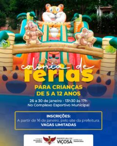 Atividades serão realizadas no Complexo Esportivo Municipal e atendem crianças de 5 a 12 anos A Prefeitura de Viçosa abre nesta sexta (16), as inscrições para a Colônia de Férias