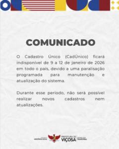 Suspensão mensal ocorre para extração de dados e verificação das informações com bases governamentais O Cadastro Único para Programas Sociais do Governo Federal (CadÚnico) ficará temporariamente indisponível em todo o