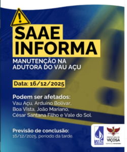 Falta d’água pode atingir sete bairros devido a reparos em adutora e reservatório nesta terça-feira. O Serviço Autônomo de Água e Esgoto (SAAE) de Viçosa informou que realiza, na manhã