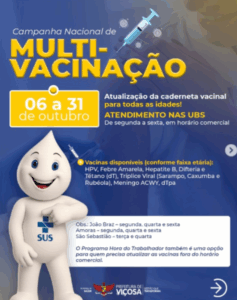 Campanha busca atualizar cadernetas de crianças e adolescentes, mas Prefeitura oferece vacinas para todas as idades nas UBS. A Prefeitura de Viçosa, através da Secretaria de Saúde, participa da Campanha