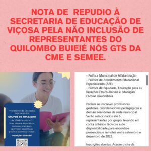 Quilombo Buieié lança Nota de Repúdio e critica Secretaria de Educação de Viçosa por exclusão em GTs da CME e SMEE.