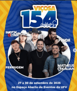 Programação dos 154 anos da cidade inclui shows no Espaço Aberto de Eventos da UFV com entrada gratuita. Viçosa se prepara para celebrar seus 154 anos com uma festa de
