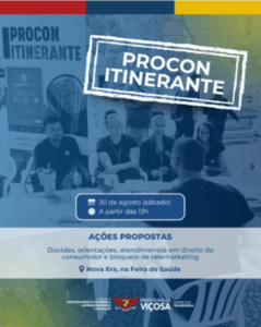 Iniciativa leva orientações e serviços de defesa do consumidor ao bairro Nova Era. O Procon Itinerante estará no bairro Nova Era neste sábado (30), a partir das 13h. A ação