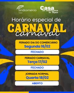 Estabelecimentos permanecem fechados nos dias 16 e 17/02 e retomam atividades na quarta-feira (18) O comércio terá alterações no horário de funcionamento durante o período de Carnaval, conforme estabelece a