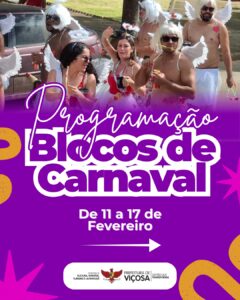 Prefeitura apoia Carnaval de Blocos 2026 com estrutura e agenda em diferentes bairros e distritos Os blocos carnavalescos voltam a movimentar Viçosa com a programação do Carnaval de Blocos 2026.