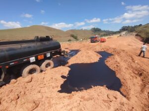 Um caminhão-tanque carregado com emulsão asfáltica perdeu os freios e derramou cerca de 13 mil litros do produto químico na altura do km 244 da BR-356, em Muriaé, nesta terça-feira (16).