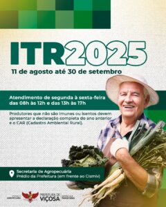 A Prefeitura de Viçosa, por meio da Secretaria Municipal de Agropecuária, informa que o prazo para a entrega da Declaração do Imposto sobre a Propriedade Territorial Rural (ITR) 2025 terá início no dia 11 de agosto e seguirá até o dia 30 de setembro.