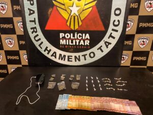 Ação da PM apreendeu drogas, dinheiro e objetos durante patrulhamento na Rua Maria Cristina.