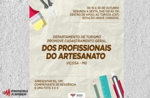 Profissionais do artesanato com residência em Viçosa podem se cadastrar junto ao Departamento de Turismo da Secretaria de Desenvolvimento Econômico da Prefeitura até 30 de outubro de 2018. O cadastro
