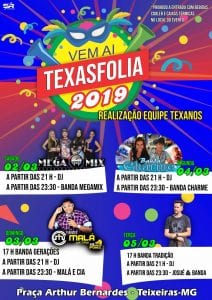 O Texas Folia 2019, realizado pela equipe Texanos divulgou a programação do carnaval 2019 que acontecerá na Praça Arthur Bernardes. Sábado 21h: DJ 23h: Banda Megamix Domingo 17h: Banda Gerações