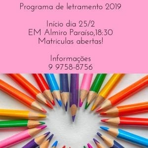 A Associação Comunitária do Paraíso divulga que estão abertas as inscrições para o Programa de Letramento 2019. As aulas, que acontecem na Escola Municipal Almiro Paraíso, começarão hoje, às 18h30