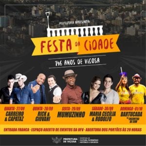 Começam hoje as festividades em comemoração aos 146 anos de Viçosa. Serão cinco dias de festas no Espaço Aberto de Eventos da UFV que contaram com a presença de nomes da música local e cantores de renome nacional. À partir das 22 horas desta quarta-feira, a dupla sertaneja de Viçosa Hugo e Marangoni abrem o palco para a dupla Carreiro & Capataz. Outra atração será a transmissão ao vivo da partida de futebol, que irá para Minas Gerais a disputa pela Copa do Brasil entre Cruzeiro x Flamengo. Os torcedores poderão acompanhar toda a partida em um super telão montando no Espaço Aberto de Eventos da UFV.