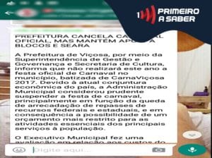 Circula nas redes sociais e grupos de WhatsApp de Viçosa a notícia de que a Prefeitura Municipal cancelou as festividades do carnaval na cidade. Segundo a nota a quantia de R$597.800,00 que seriam usados para contratação de bandas de renome nacional e montagem de toda a estrutura da festa seriam destinados exclusivamente para o Hospital São João Batista, que na última quinta-feira 16, ficou fechado por pelo menos três horas por falta de materiais básicos, como por exemplo, luvas.