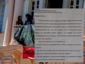 Os estudantes que estão ocupando o Edifício Arthur da Silva Bernardes, popularmente conhecido como “Bernardão” cobrando da Universidade Federal de Viçosa e do Conselho Universitário da UFV u posicionamento contrário