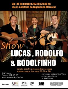 Nesta sexta feira, 18 de outubro, a partir das 20 horas, acontecerá o show de Lucas, Rodolfo e Rodolfinho, no auditório do departamento de engenharia florestal, na UFV. O objetivo