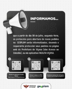 A Prefeitura Municipal de Viçosa informou, via redes sociais, nesta quinta-feira, que, a partir do dia 8 de julho (segunda-feira), o GEOPLAM irá informatizar os protocolos para abertura de pedidos.