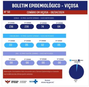 Segundo o Setor de Vigilância Epidemiológica da Secretaria Municipal de Saúde, o município de Viçosa notificou 544 casos de dengue nas últimas quatro semanas. Além disso, foram registrados 15 casos