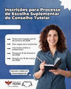 Processo prevê preenchimento de 10 vagas de suplentes para o mandato em curso até janeiro de 2028 O Conselho Municipal dos Direitos da Criança e do Adolescente de Viçosa (CMDCA)