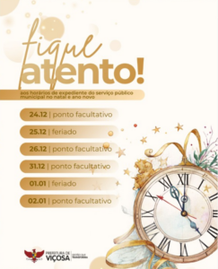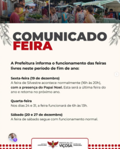 Mudança ocorre apenas nas feiras de quarta-feira nos dias 24 e 31 de dezembro; funcionamento de sábado permanece inalterado De acordo com o comunicado da prefeitura de Viçosa, as feiras