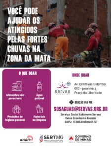 Ação mobilizada pela AMIRT, em parceria com o Servas e apoio do Governo de Minas, busca arrecadar alimentos, água e produtos de higiene para famílias atingidas pelos temporais A AMIRT