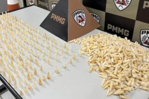 Denúncias anônimas levaram à descoberta de entorpecentes em área conhecida como “fazendinha”; suspeito não foi localizado A Polícia Militar apreendeu 1.170 pinos de cocaína na noite desta quinta-feira (23) em
