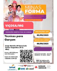 Programa Minas Forma oferece 20 vagas com bolsa-auxílio para alunos matriculados A cidade de Viçosa abriu novas inscrições para o curso gratuito de Técnicas para Garçom, dentro do programa Minas