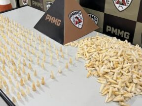 Denúncias anônimas levaram à descoberta de entorpecentes em área conhecida como “fazendinha”; suspeito não foi localizado A Polícia Militar apreendeu 1.170 pinos de cocaína na noite desta quinta-feira (23) em
