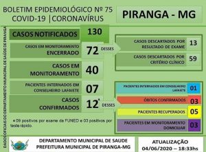 Com 03 óbitos decorrentes da Pandemia do Coronavírus, Piranga registra 12 Casos confirmados e 08 pacientes continuam internados. Segundo a Superintendência Regional de Saúde de Barbacena, Piranga já pode ser