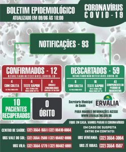 Nessa terça-feira (08), Ervália confirmou o 12º caso de coronavírus no município. De acordo com a prefeitura, foi realizado pela estratégia de saúde da família nesta segunda-feira o teste rápido