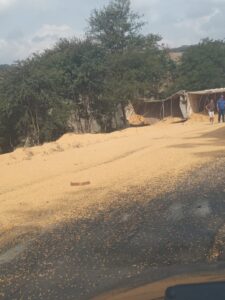 Carreta carregada de milho tomba e trava via em Teixeiras