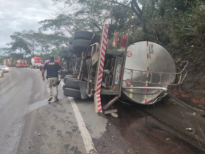 Motorista morre esmagado após carreta tombar na BR-356, em Muriaé