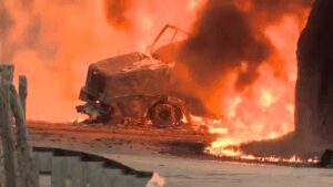 MG-353 SEGUE INTERDITADA APÓS EXPLOSÃO DE CARRETA COM COMBUSTÍVEL; MOTORISTA DE 29 ANOS MORREU CARBORIZADO
