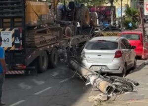 Acidente deixa trânsito em meia pista e causa danos materiais, não houve feridos. Na tarde desta terça-feira (1º), uma carreta que transportava dois maquinários derrubou um poste na Travessa César