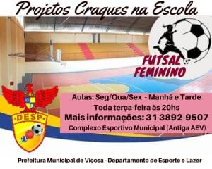 O Projetos Craques na Escola está realizando aulas de futsal feminino. As aulas acontecem segunda, quarta e sexta-feira, nos turnos da manhã e da tarde e nas terças à noite,