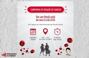 Neste sábado (27/09) haverá coleta de sangue a partir das 7h30 no CEE – UFV. Uma ótima oportunidade para você realizar uma boa ação e possivelmente salvar uma vida. Mas