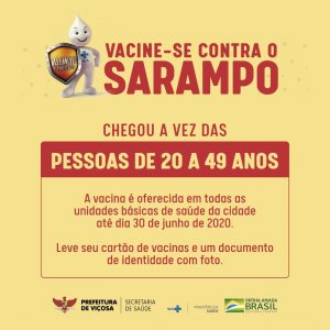 A Prefeitura de Viçosa realiza a vacinação contra o sarampo para pessoas com faixa etária entre 20 e 49 anos. O objetivo é incentivar que o público-alvo atualize o cartão