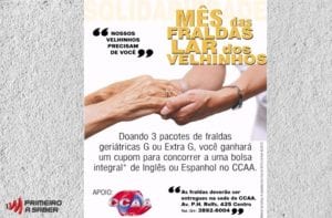 A escola de idiomas CCAA filial Viçosa sensibilizada com a atual situação de escassez de fraldas geriátricas no Lar dos Velhinhos – Viçosa está promovendo uma campanha de arrecadação do produto.