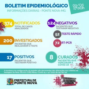 Nessa terça-feira (09), Ponte Nova divulgou o novo boletim epidemiológico. A atual situação do município de Ponte Nova é de trezentos e setenta e quatro (374) casos suspeitos notificados para