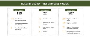 De acordo com o Boletim Diário divulgado pela Vigilância Epidemiológica da Prefeitura de Viçosa, a cidade registra 119 casos investigados, estando 118 pacientes em isolamento domiciliar, 1 paciente internado em