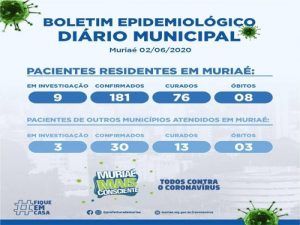 Casos confirmados de coronavírus subiram para 211 em Muriaé nesta terça-feira, dia 2 de junho, sendo 181 de pessoas residentes na cidade e 30 de pacientes de fora do município.