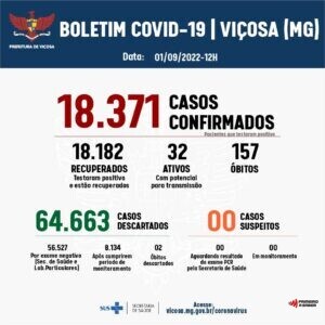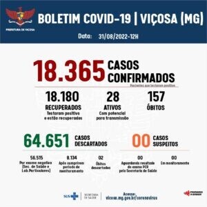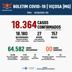Com o novo caso de Covid-19 confirmado, Viçosa tem agora 18.382 diagnósticos positivos desde o início da pandemia. Há apenas um caso ativo. De acordo com os dados do 719º