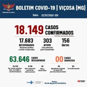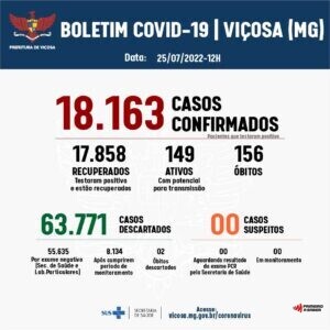 Viçosa tem, atualmente, 149 casos ativos de Covid-19. Foram 21 novos casos e 175 altas registradas durante o fim de semana. A Vigilância Epidemiológica divulga o 688º Boletim Epidemiológico de