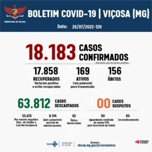 Ninguém está internado no CTI com Covid-19 em Viçosa. Com os novos casos, o município tem 18.212 confirmações. A Vigilância Epidemiológica divulga o 691º Boletim Epidemiológico de Covid-19, nesta quinta-feira,