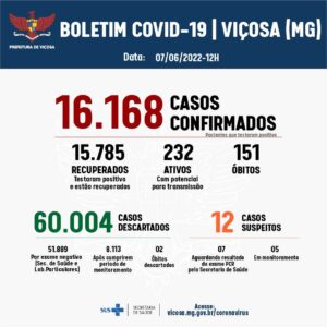 A Vigilância Epidemiológica divulga o 656º Boletim Epidemiológico de Covid-19, nesta terça-feira, 07, referente às últimas 24 horas. Foram realizados 74 testes de detecção do Coronavírus, sendo 19 resultados positivos