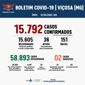 A Vigilância Epidemiológica divulga o 638º Boletim Epidemiológico de Covid-19, nesta quinta-feira, 12. Foram realizados 38 testes de detecção do Coronavírus, sendo 15 resultados positivos e 23 negativos. Foram registradas